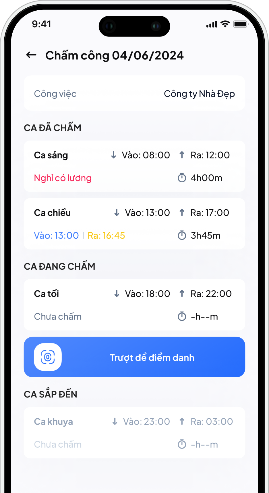 Chấm công chỉ với 3 giây. Không còn quy trình phức tạp hoặc chờ đợi "xin thử lại" - tất cả sẵn sàng với chỉ một chạm.